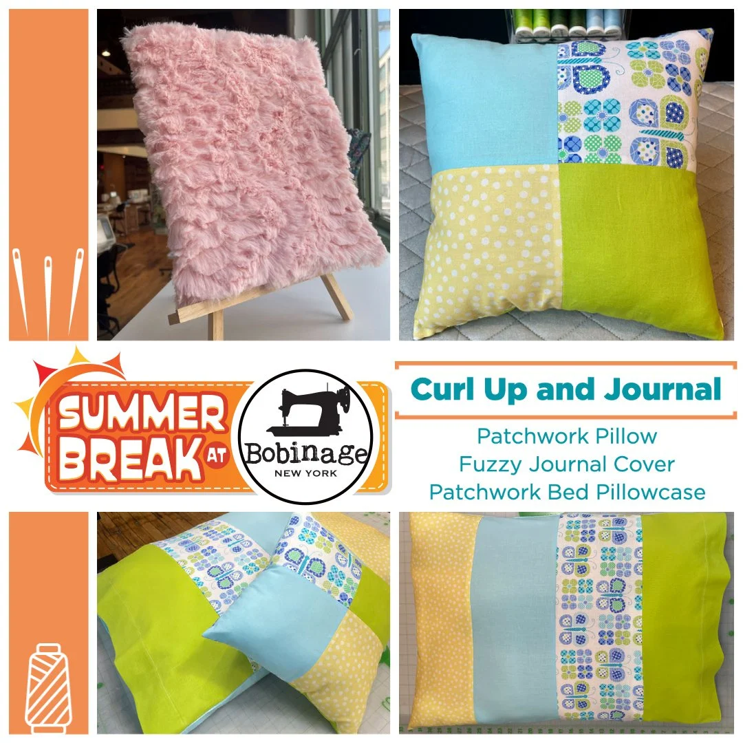 Learn basic sewing skills and have lots of fun at the Summer Break at Bobinage! In this session, students will make a Patchwork Throw Pillow, a Fuzzy Journal Cover, and a Patchwork Bed Pillow Case. Fabrics for projects can vary and colors are chosen by the students. Classes are for children aged 9+, and sessions are held at our in-house studio on Janome sewing machines.