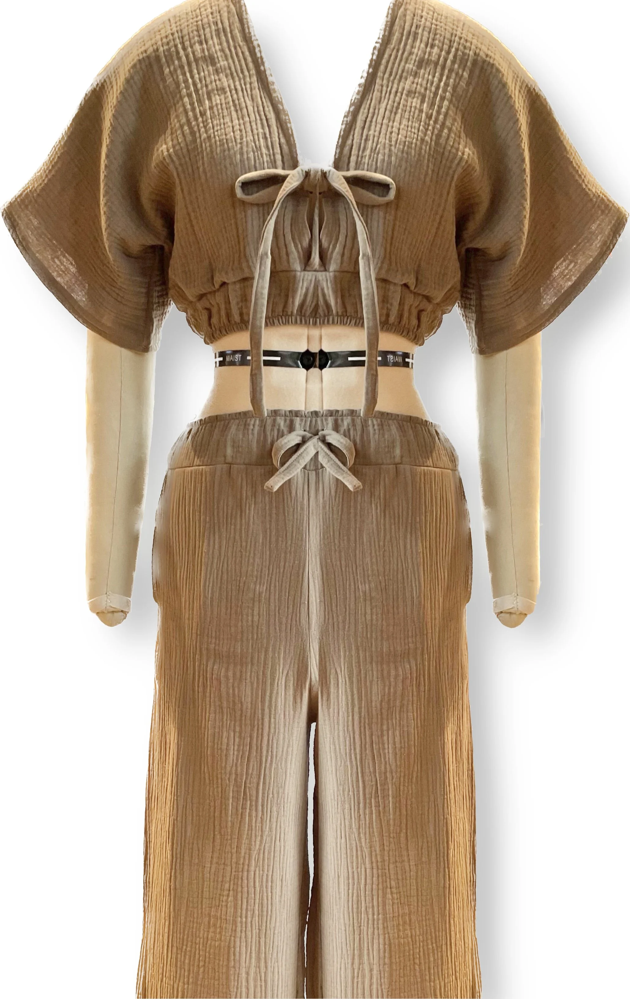 Sew either the top or pants from this pattern by Friday Pattern Company. The Saguaro Set is a two piece woven set made up of elastic waistband pants and a pullover top. This is the perfect flowy outfit for summer excursions! The top has a plunging V neckline that includes an optional tie closure. You can wear the top backwards or forwards. The pants feature roomy pockets and a waistband with a drawstring.